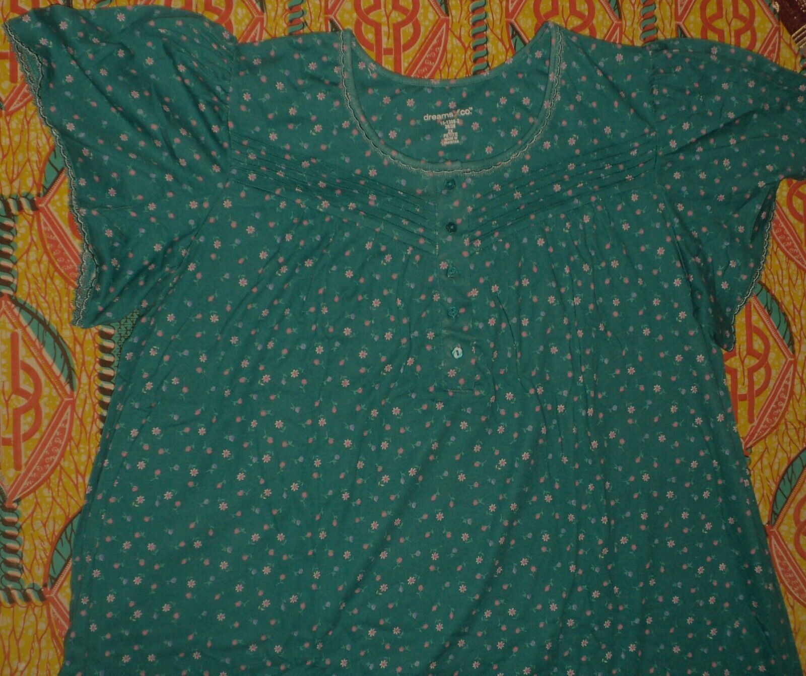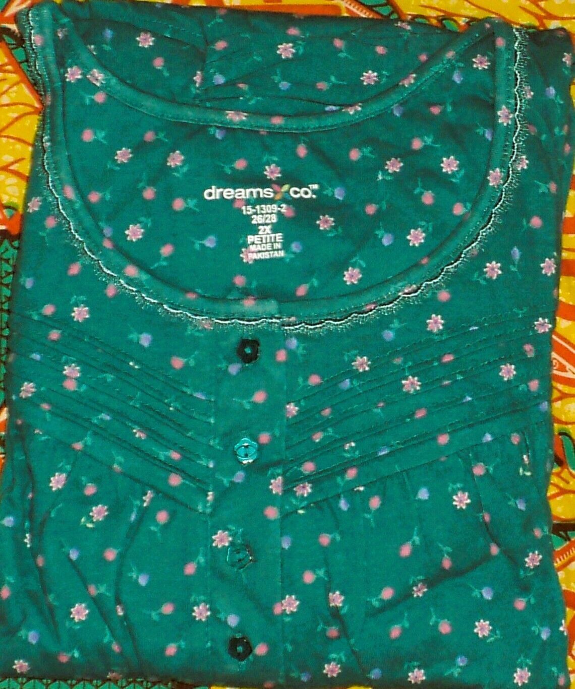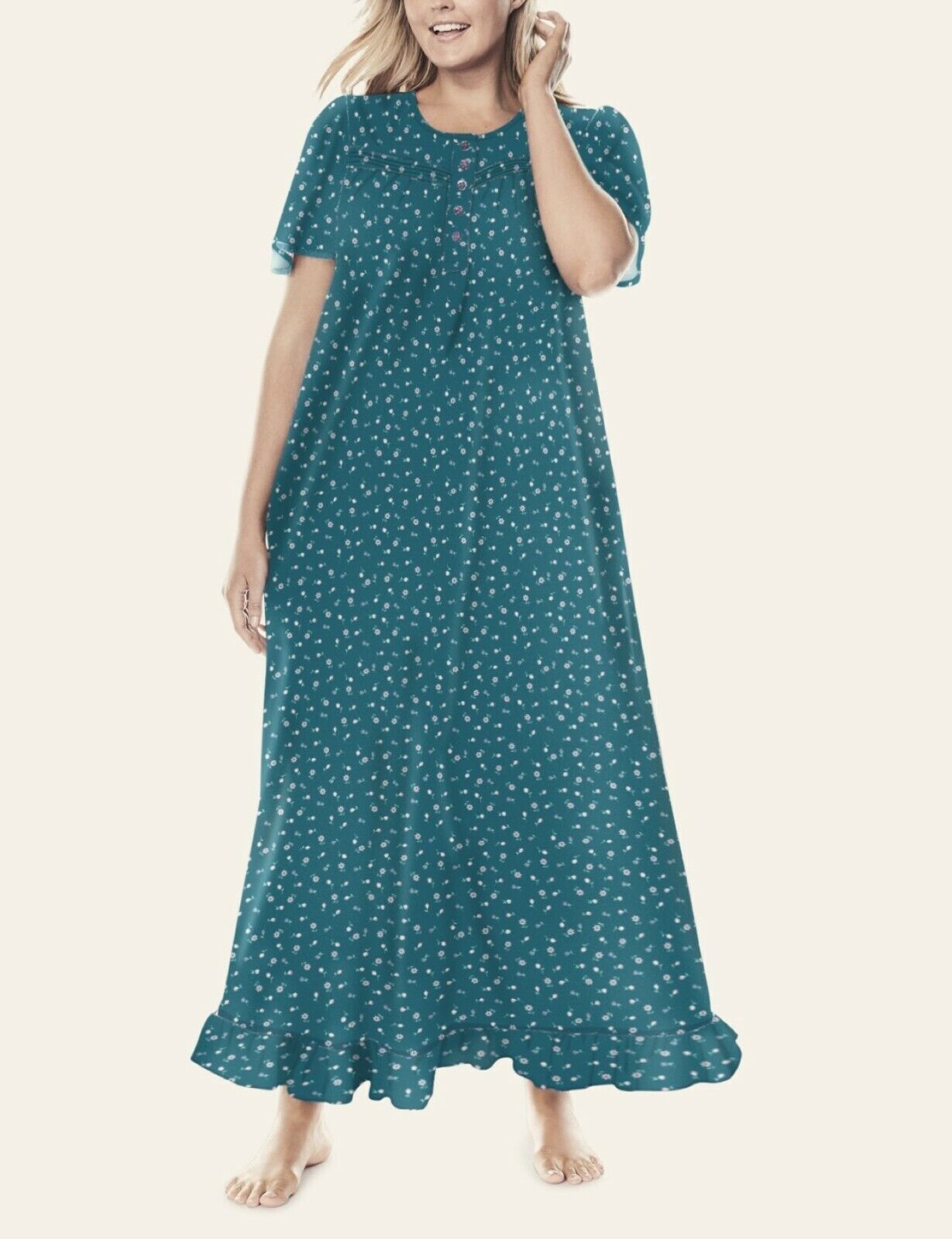 Dreams & Co. Plus Size Petite Deep Teal Ditsy Long Cotton Knit Nightgown Sz L