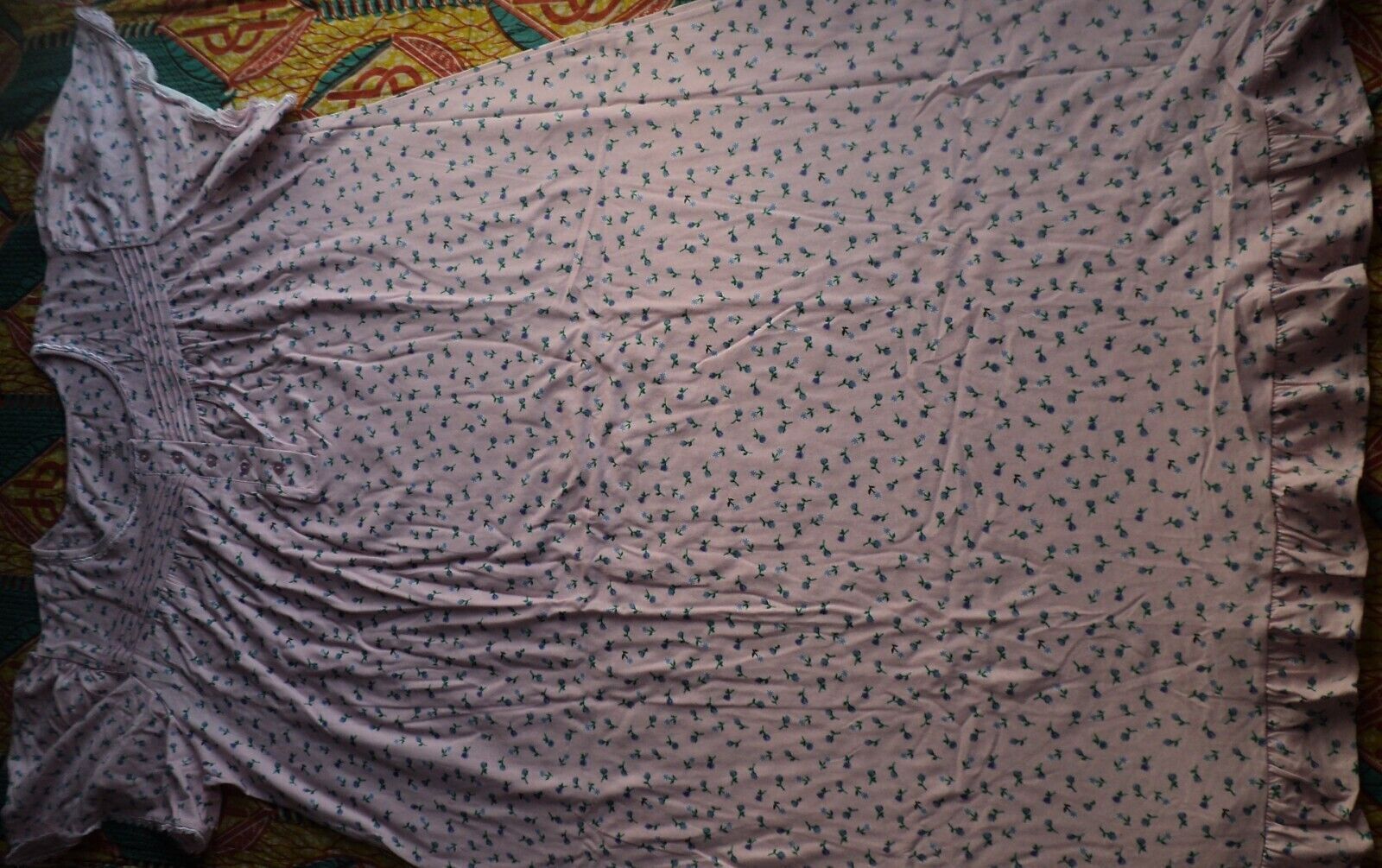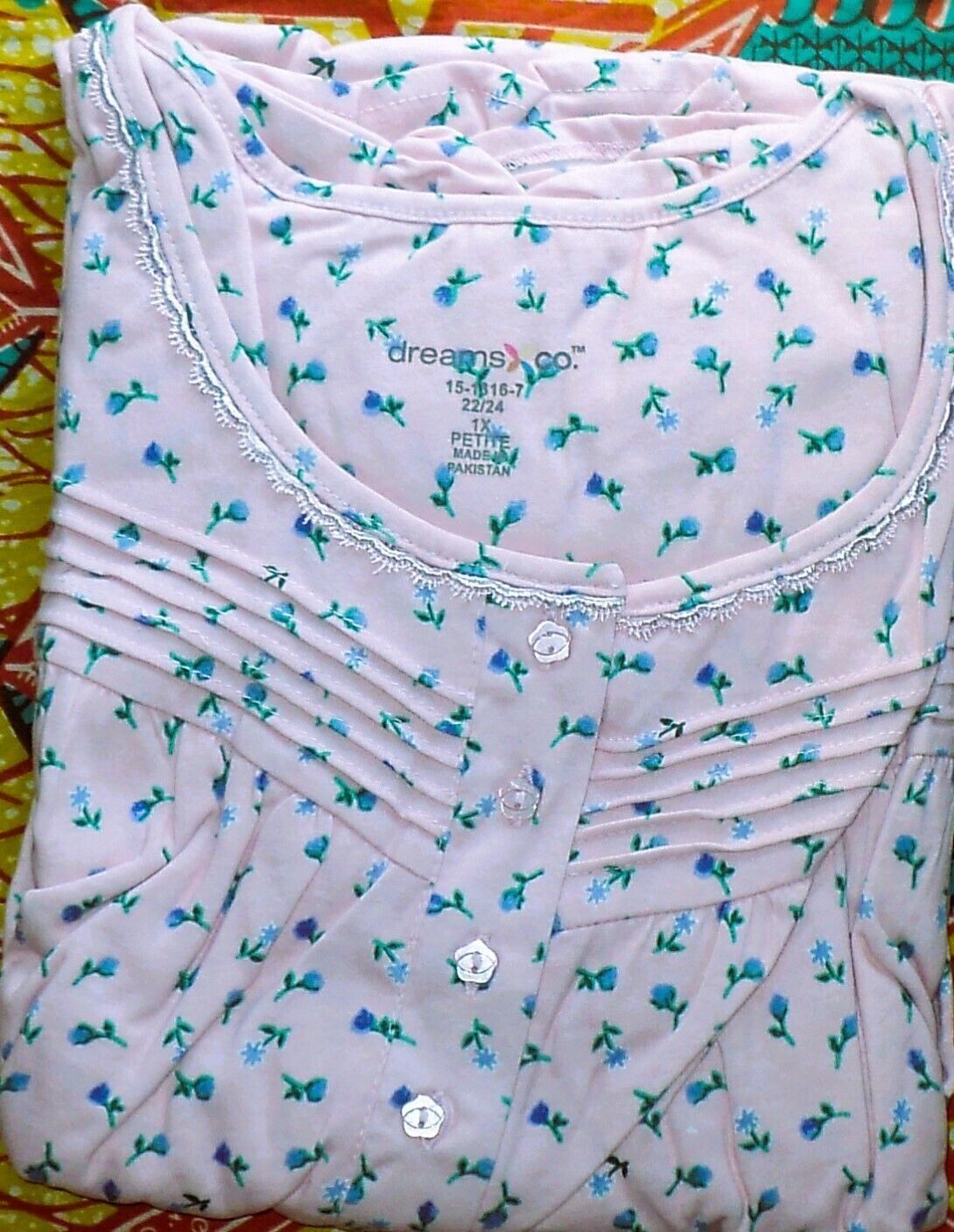 Plus size long cotton knit gown by Dreams & Co. A-line flair. This gown comes in a plethora of cute patterns!