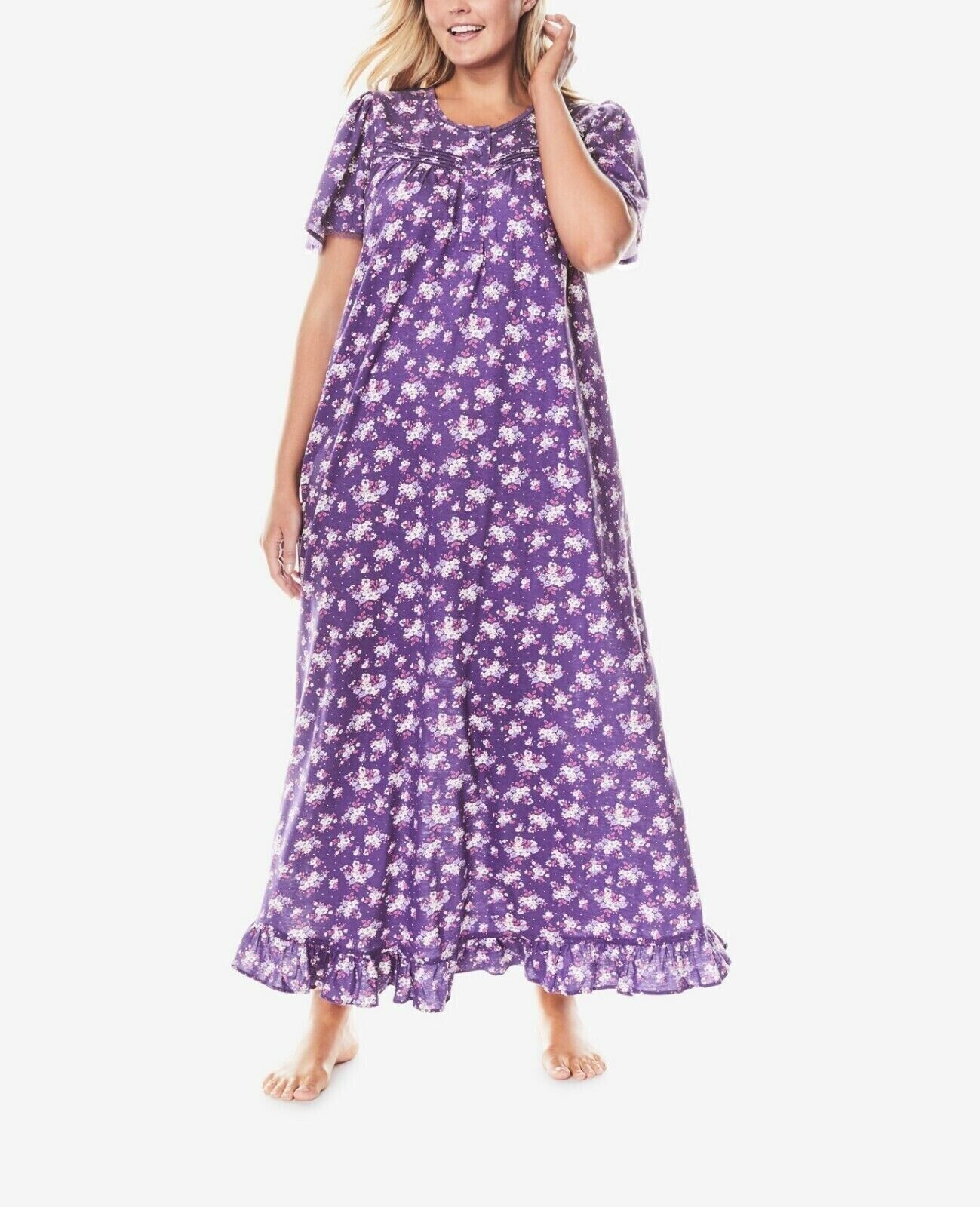 Plus size long cotton knit gown by Dreams & Co. A-line flair. This gown comes in a plethora of cute patterns!