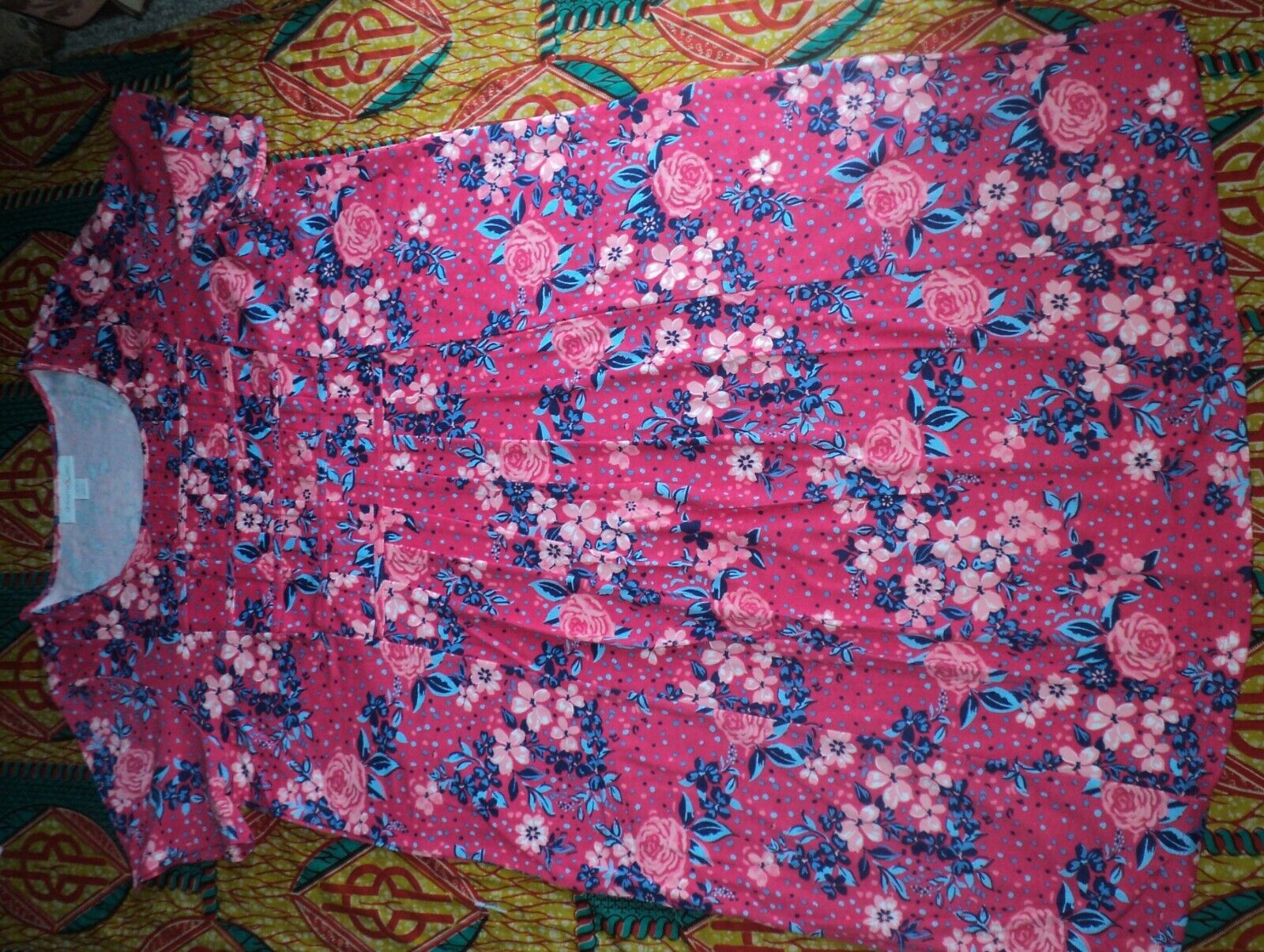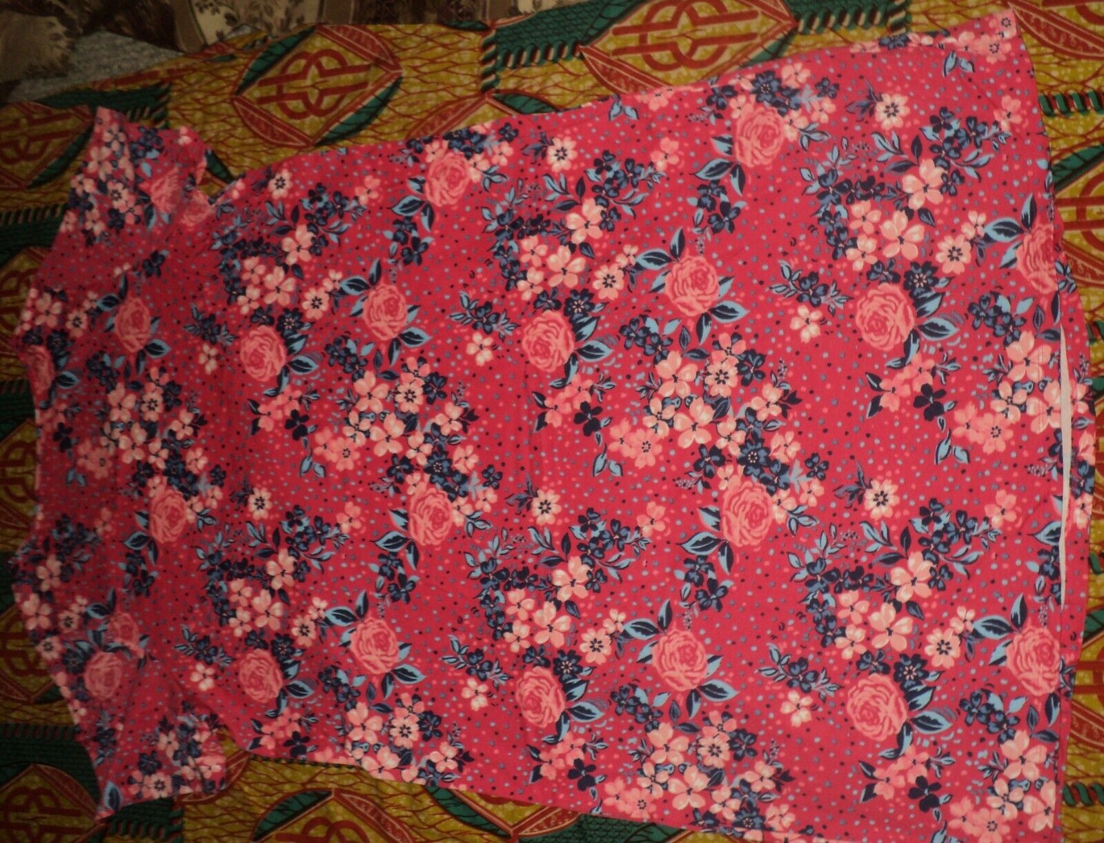 the skirt, short sleeves. Bust: 56”. Hips: 62". Shoulder to base 44" length. 60% Cotton/40%