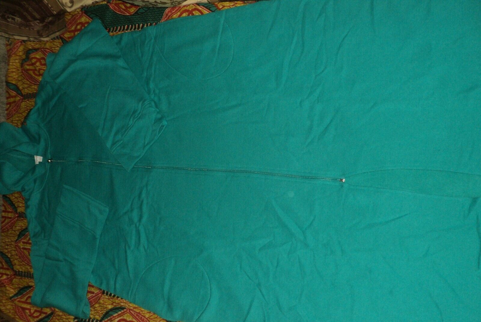 Plus size long fleece hoodie robe by Dreams & Co. A-line silhouette. Crew neckline connects to a hood. Long sleeves with self cuffs. Zip front opens all the way. Side pockets. Bust: 52”. Shoulder to base 53" long. 60% cotton/40% polyester. Washable cotton/polyester knit fleece. Imported. Brand new in bag with size tag on the bag. Color Waterfall. Size 1X(22/24).