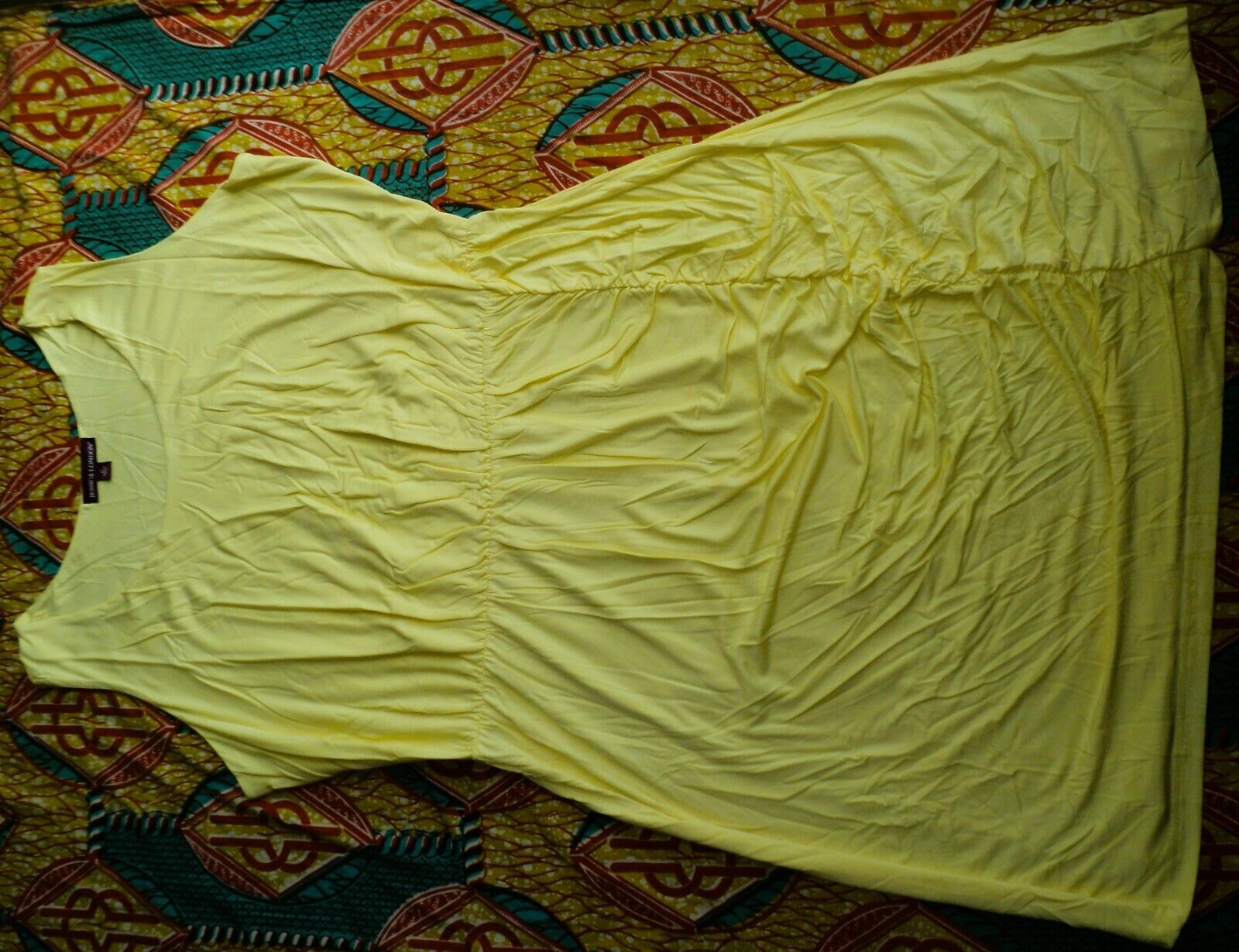 Plus size ruched or shirred side short dress by Jessica London. Scoop neck tank dress. Sleeveless dress with set-in armholes. Elastic waist. Bust: 45”. Hips: 47". Shoulder to base 411/2". 95% Rayon/5% spandex. Machine wash; imported. Brand new in bag with size tag on the bag. Color Bright Lemon. Size 22.