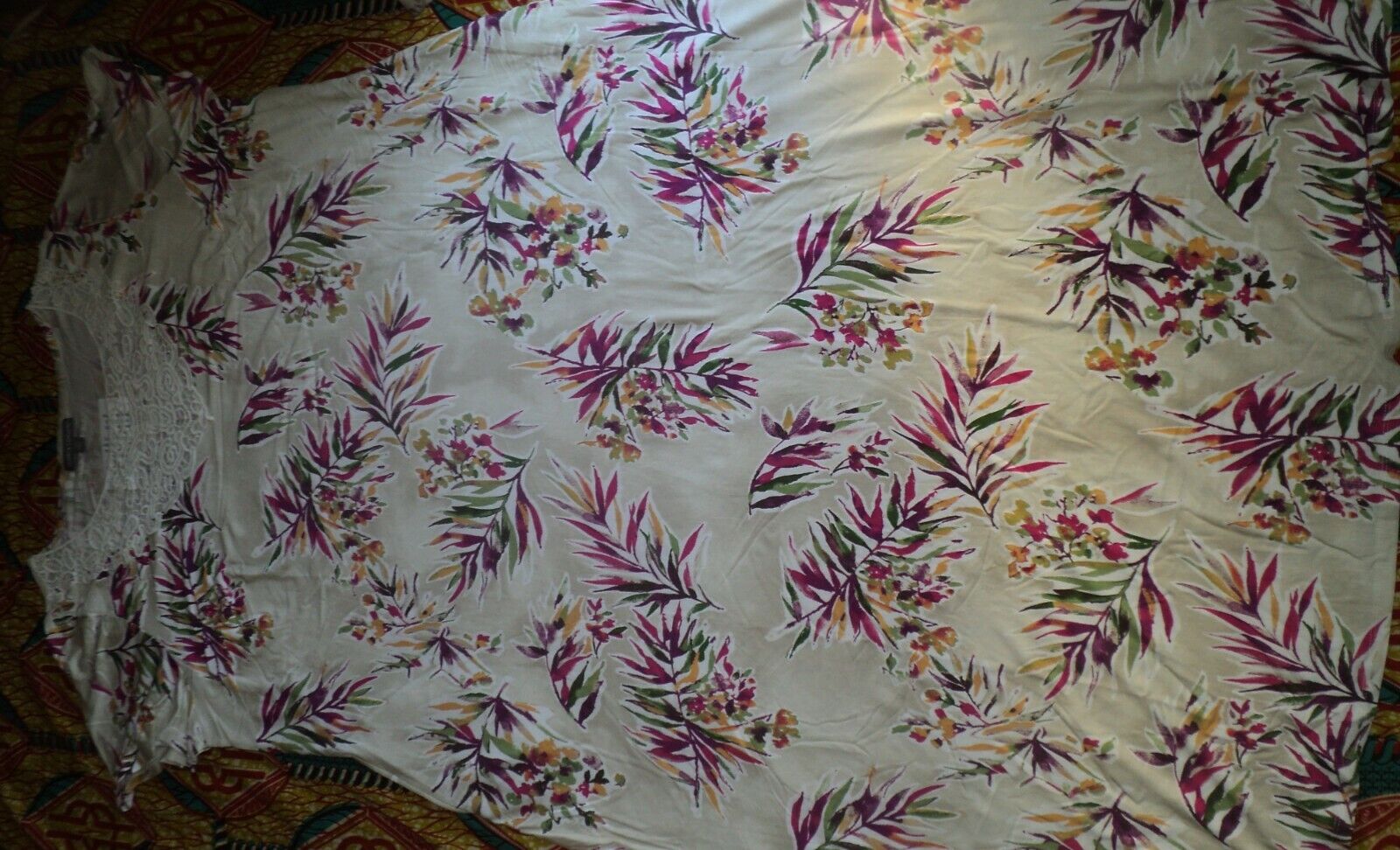 Plus size applique maxi dress by Jessica London. A scoop neckline with crochet applique at neckline for added style. A-line silhouette. Short sleeves. Side seam pockets.