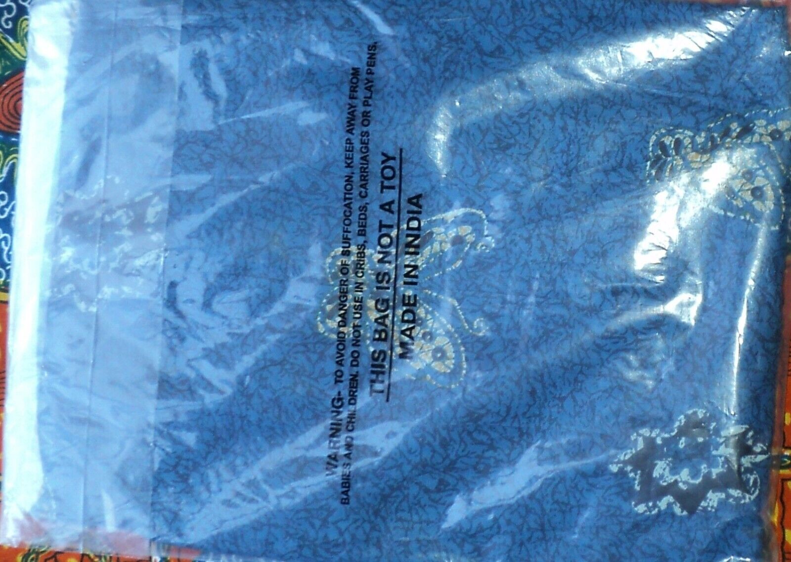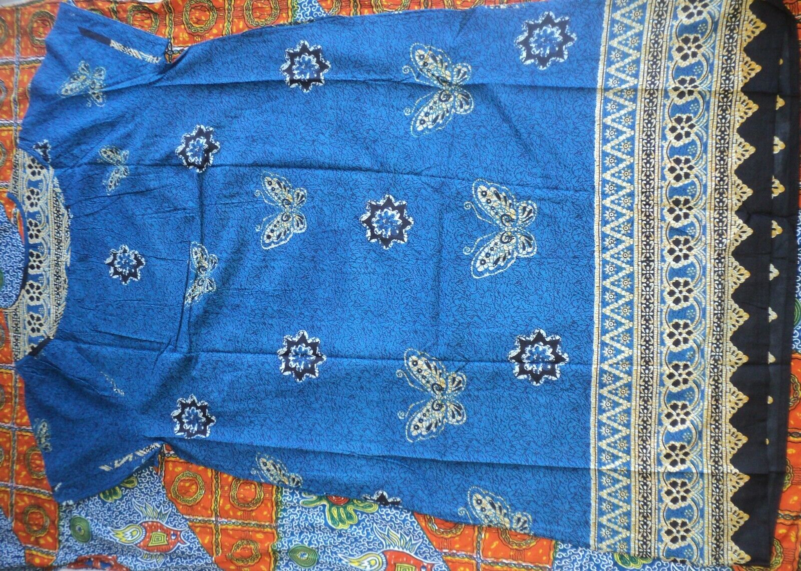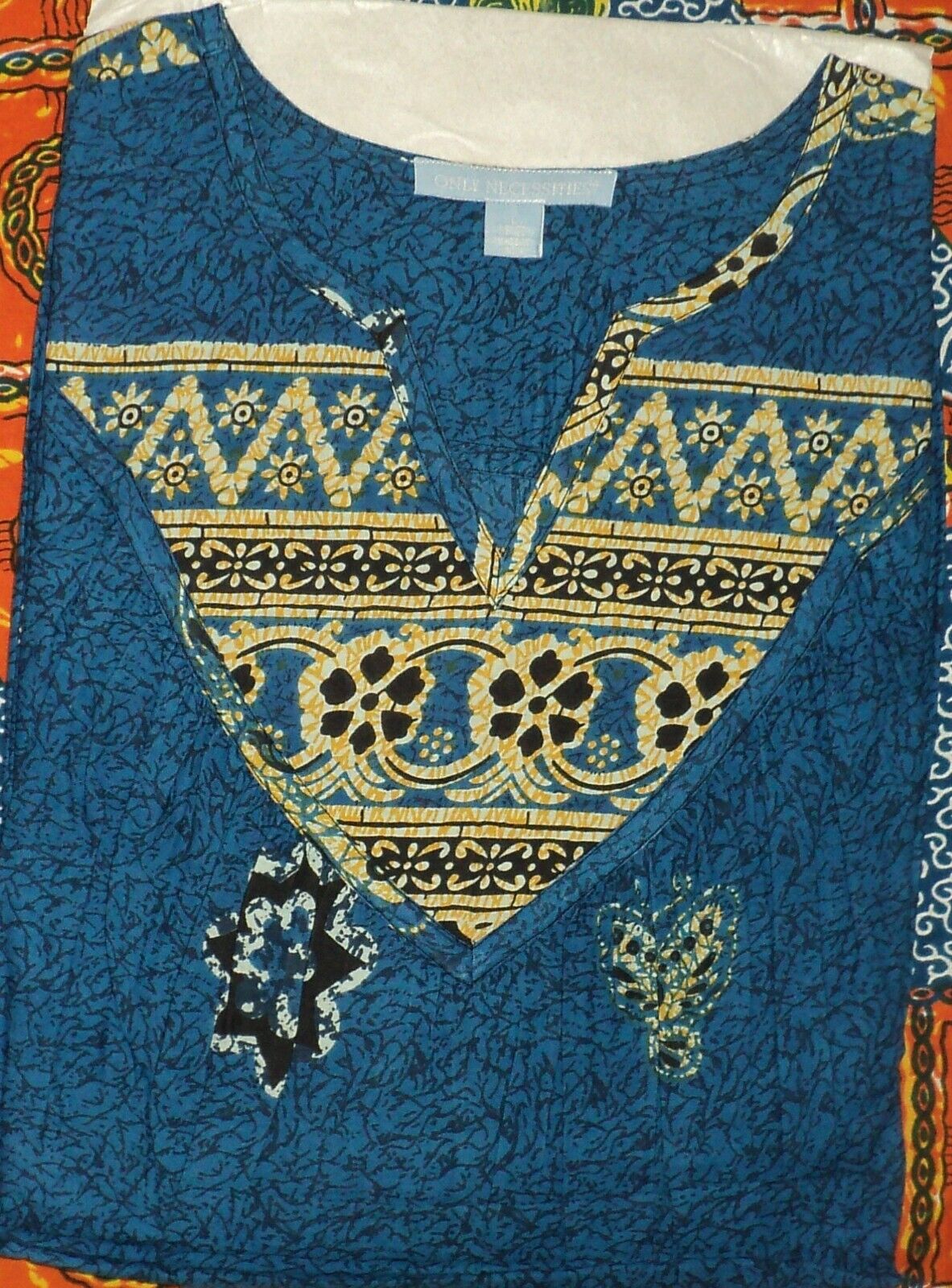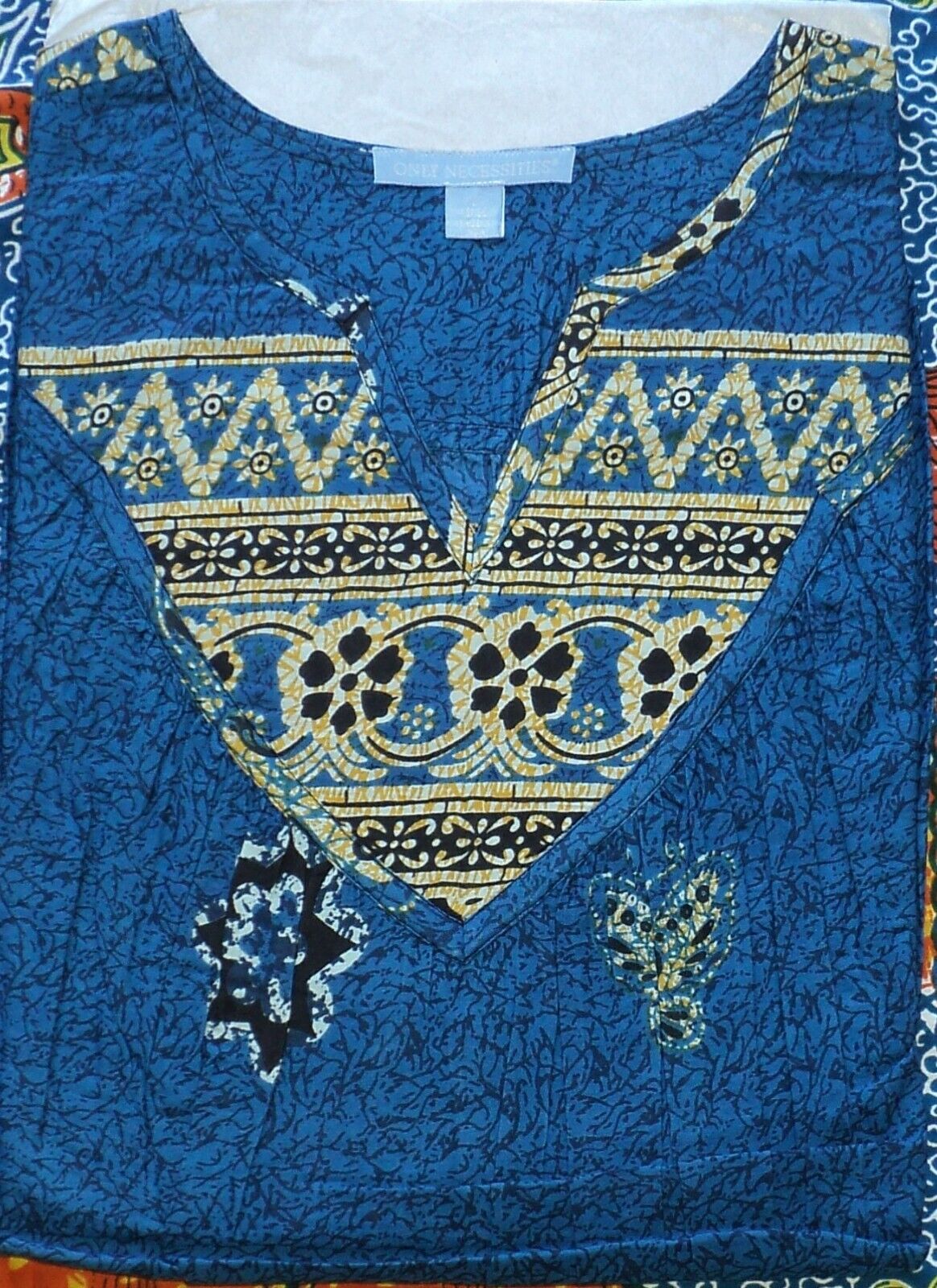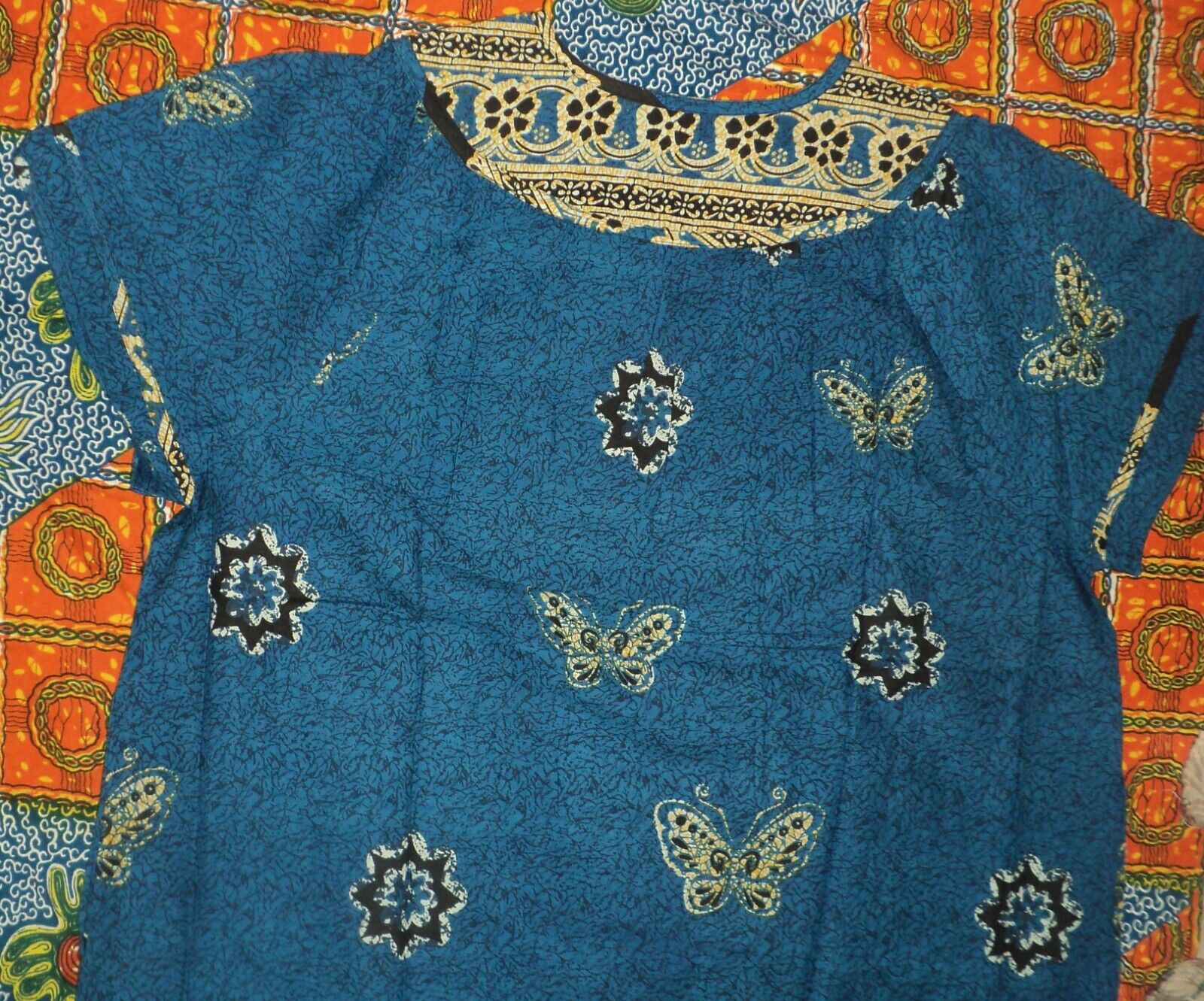 cotton cambric; imported. Brand new in bag with size tag on the bag. Color Blue Butterfly. Size 1X(22/24).