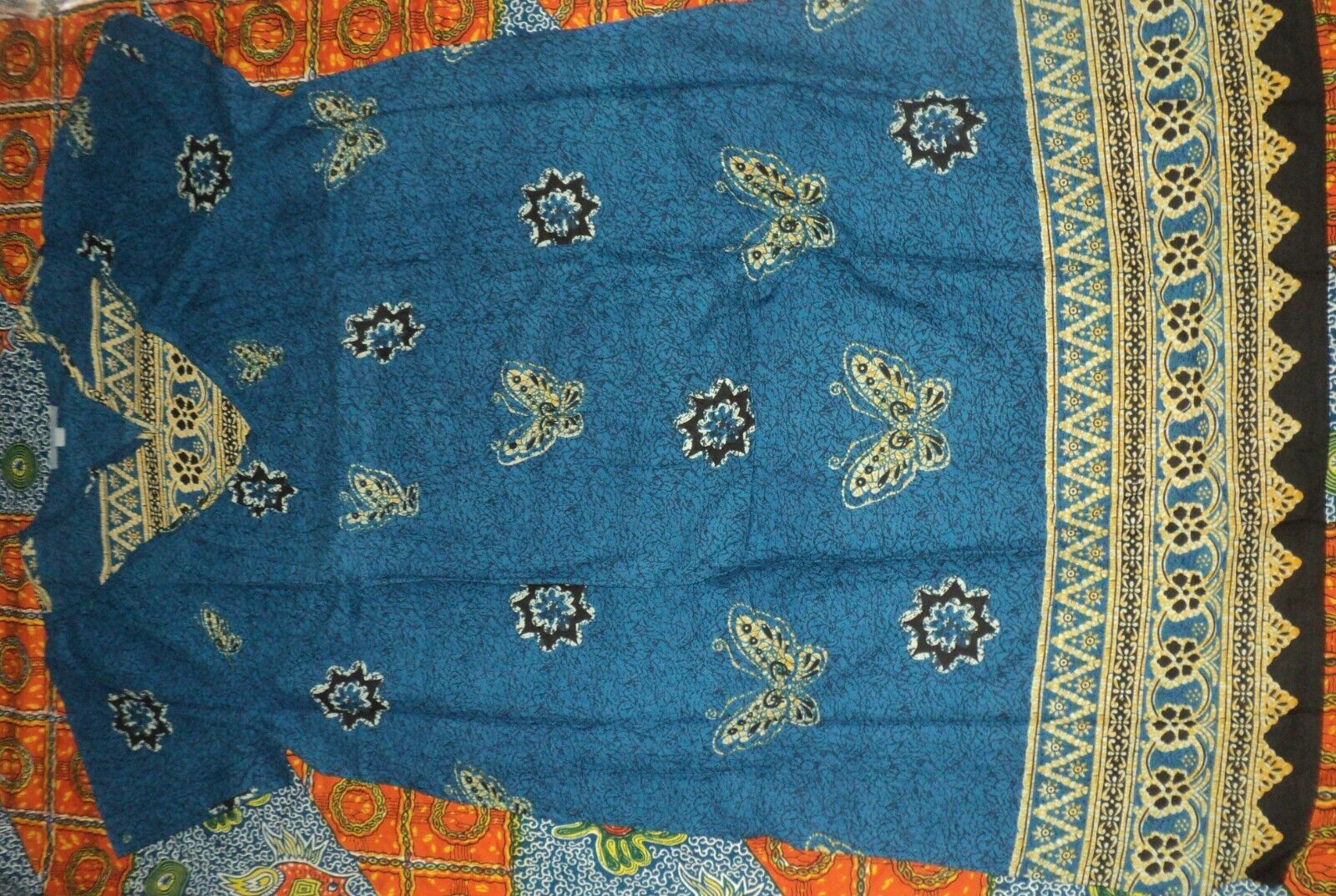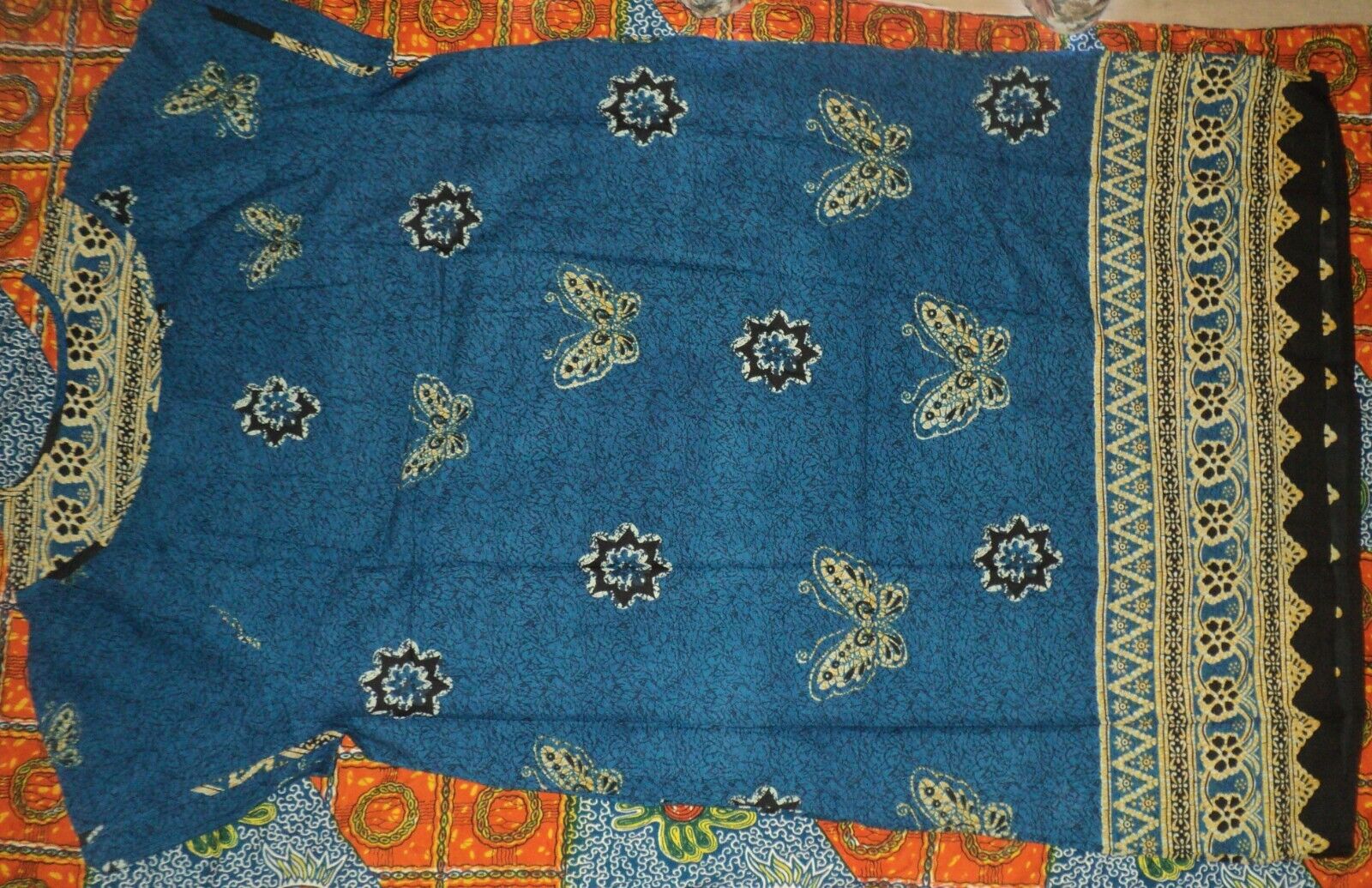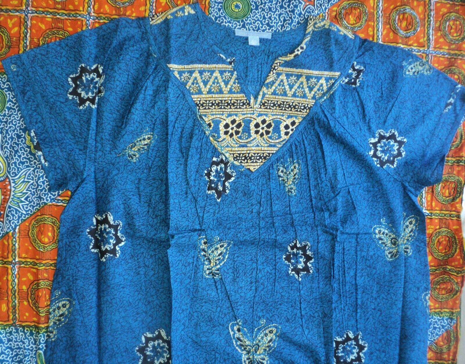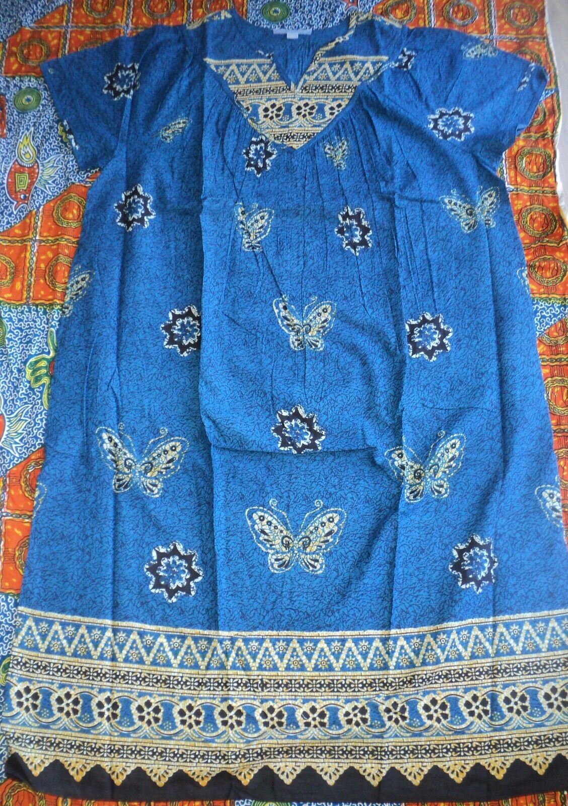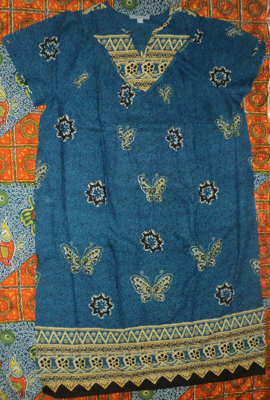 short sleeves, shirring and border print. Side pocket. Bust: 55”. Shoulder to base 49". 100% cotton. Washable