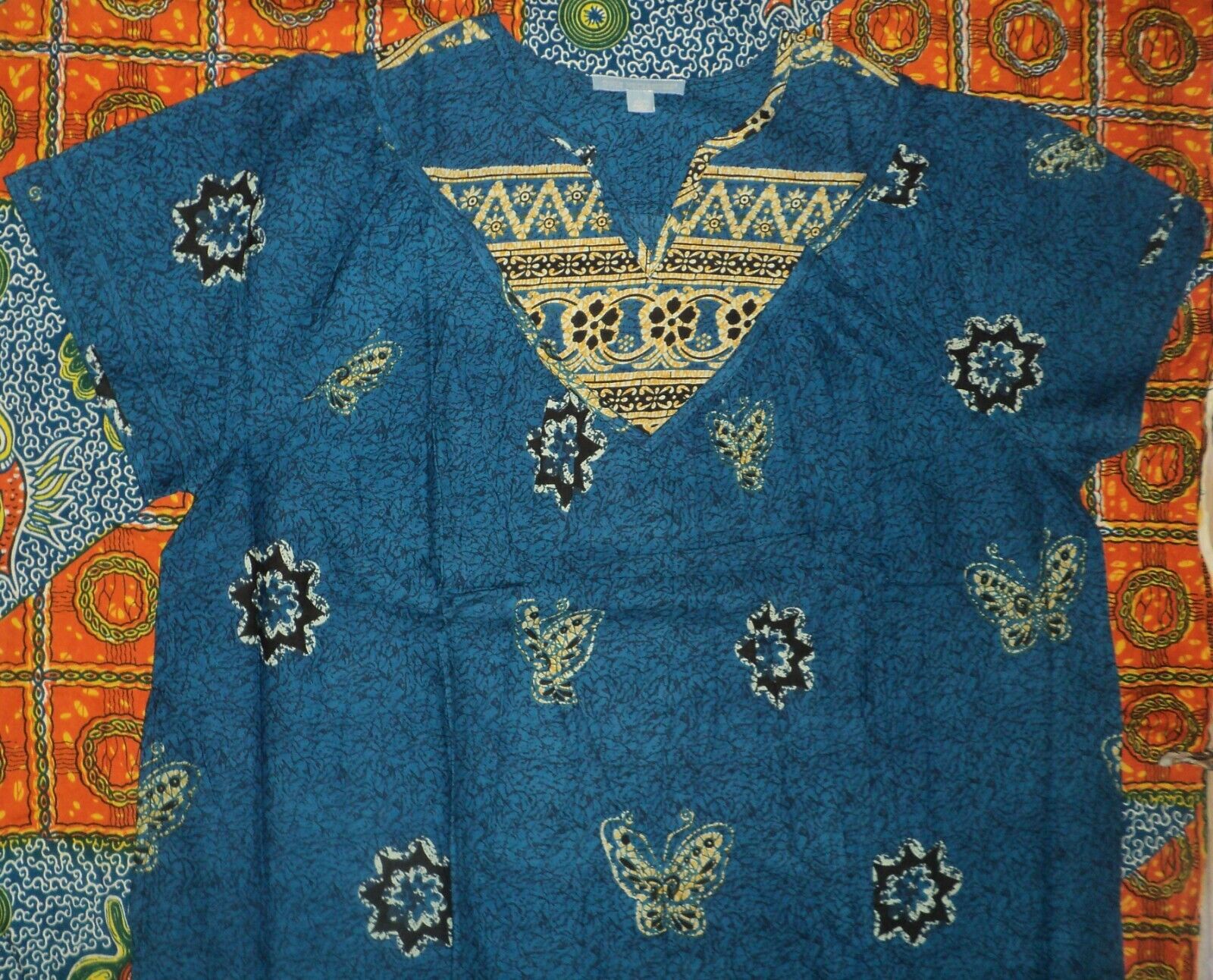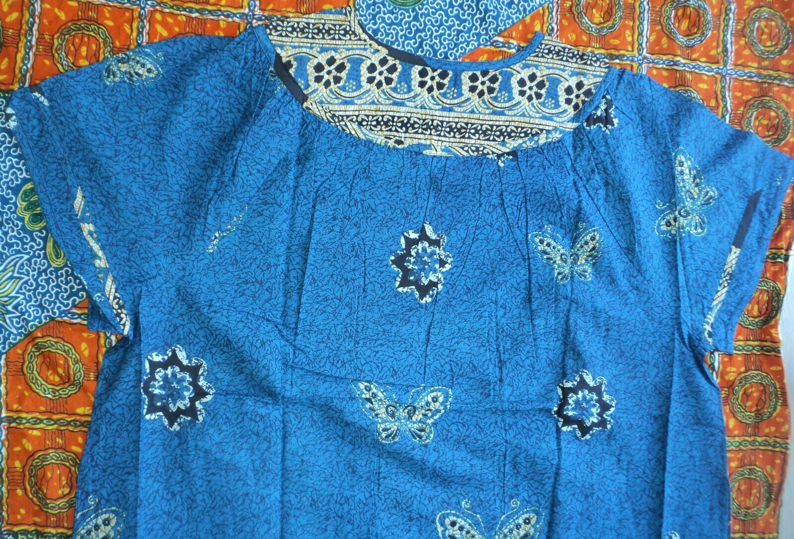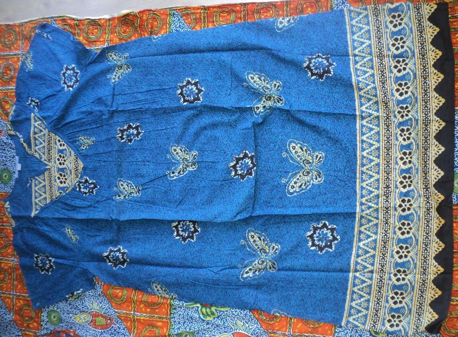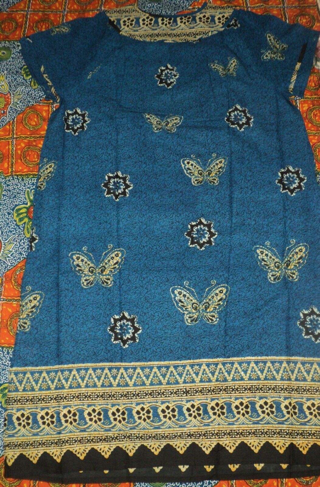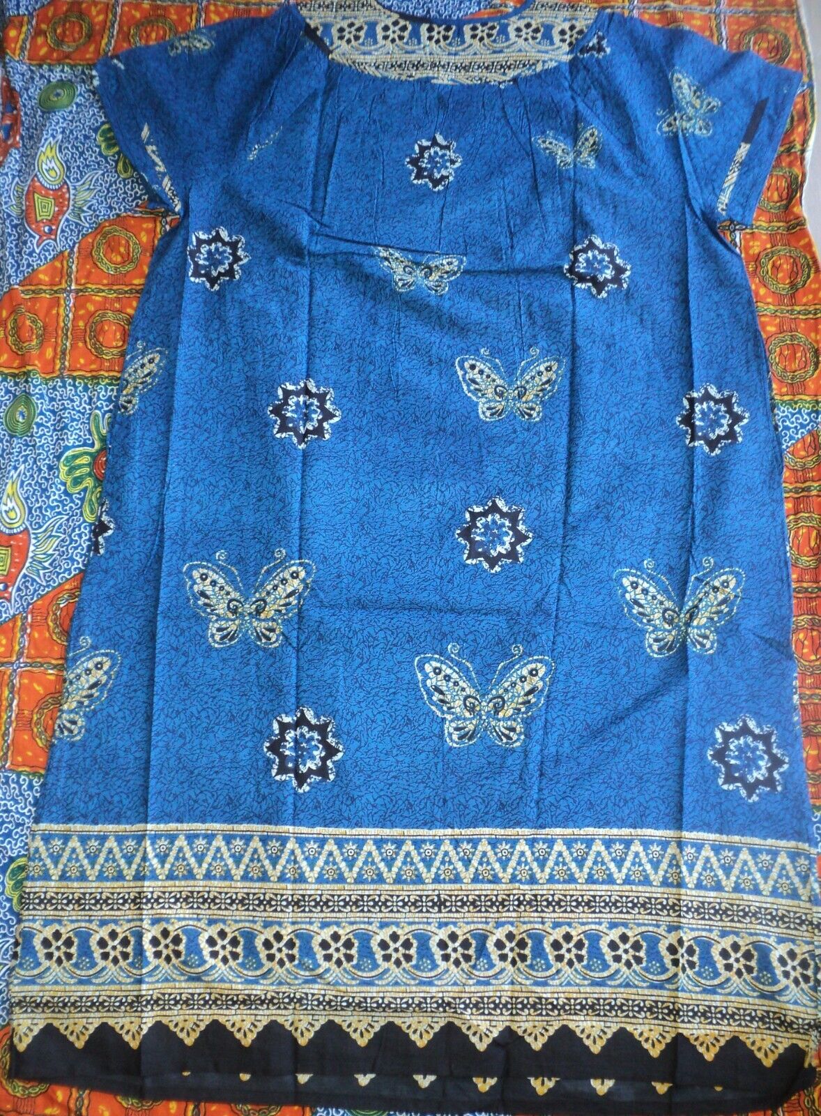 short sleeves, shirring and border print. Side pocket. Bust: 55”. Shoulder to base 49". 100% cotton. Washable