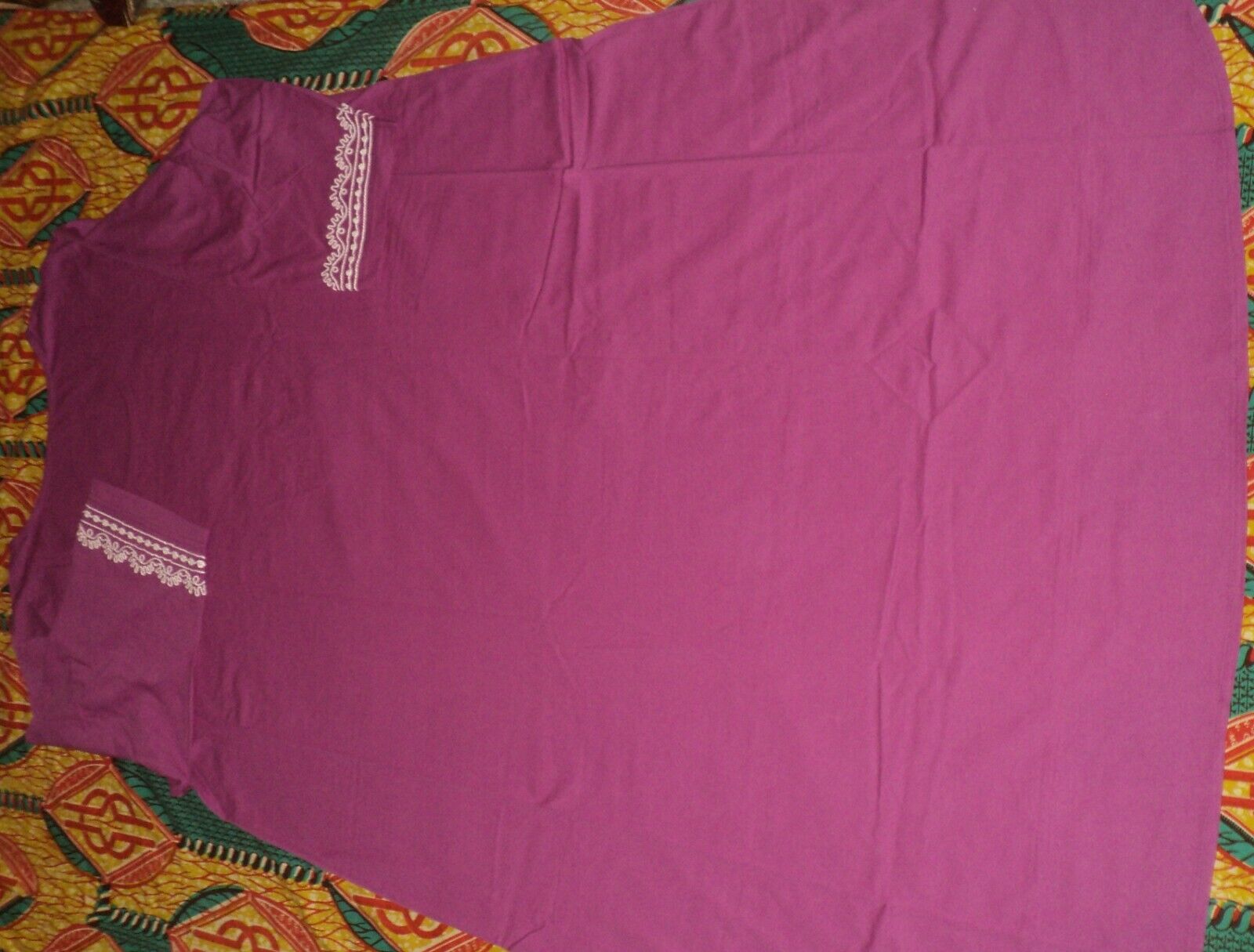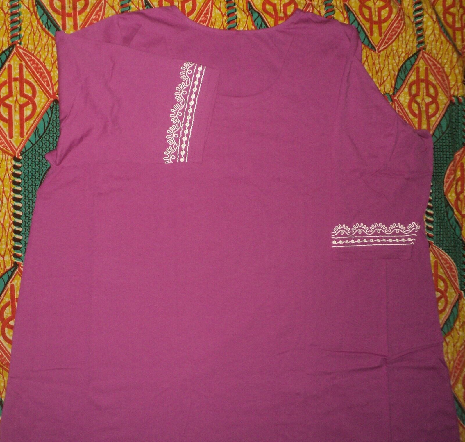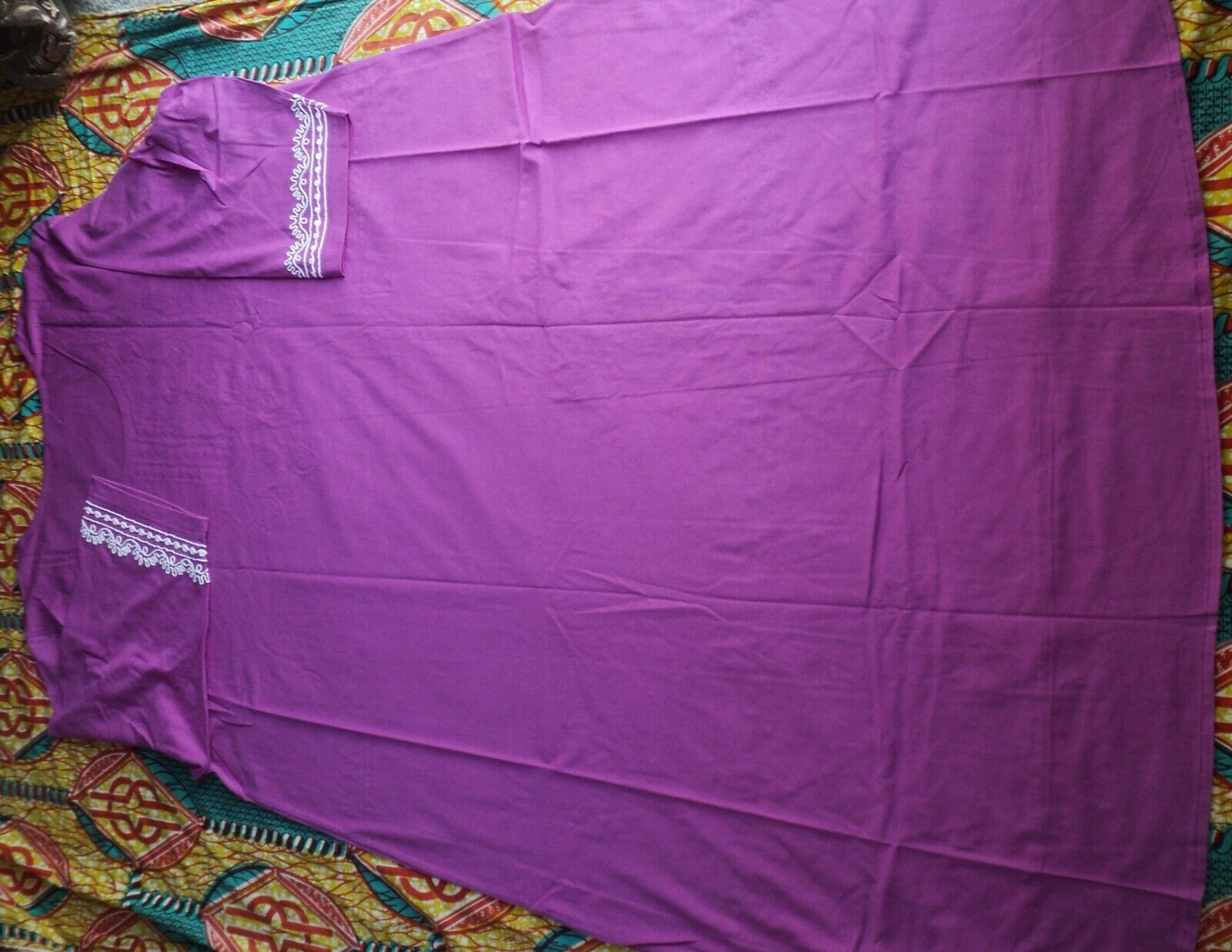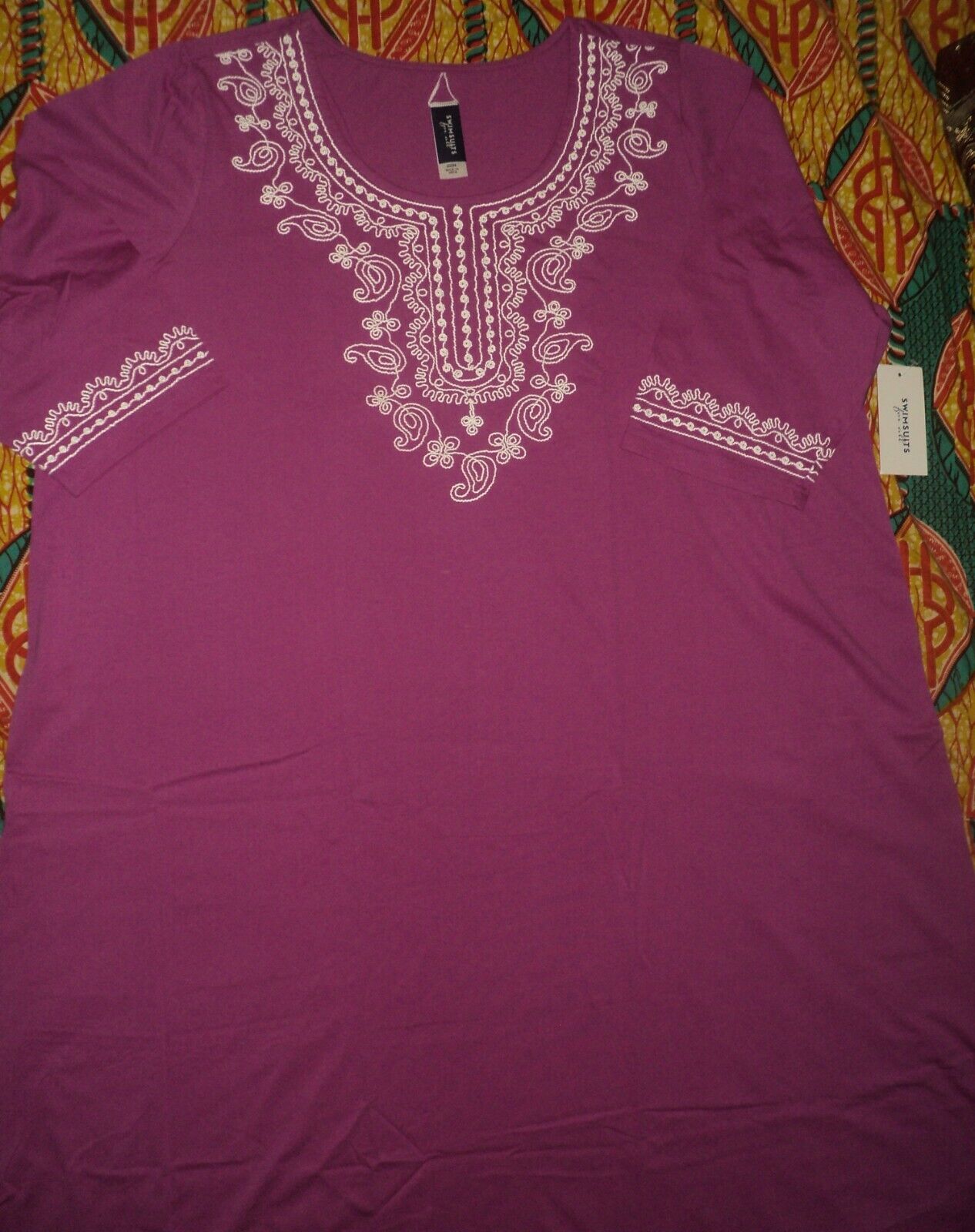 Embroidered scoop neckline and cuffs with a high-low hem and side slits. 3/4 sleeves. Bust: 64”. Hips: 74”. Front: Shoulder to base 47" length. Back: