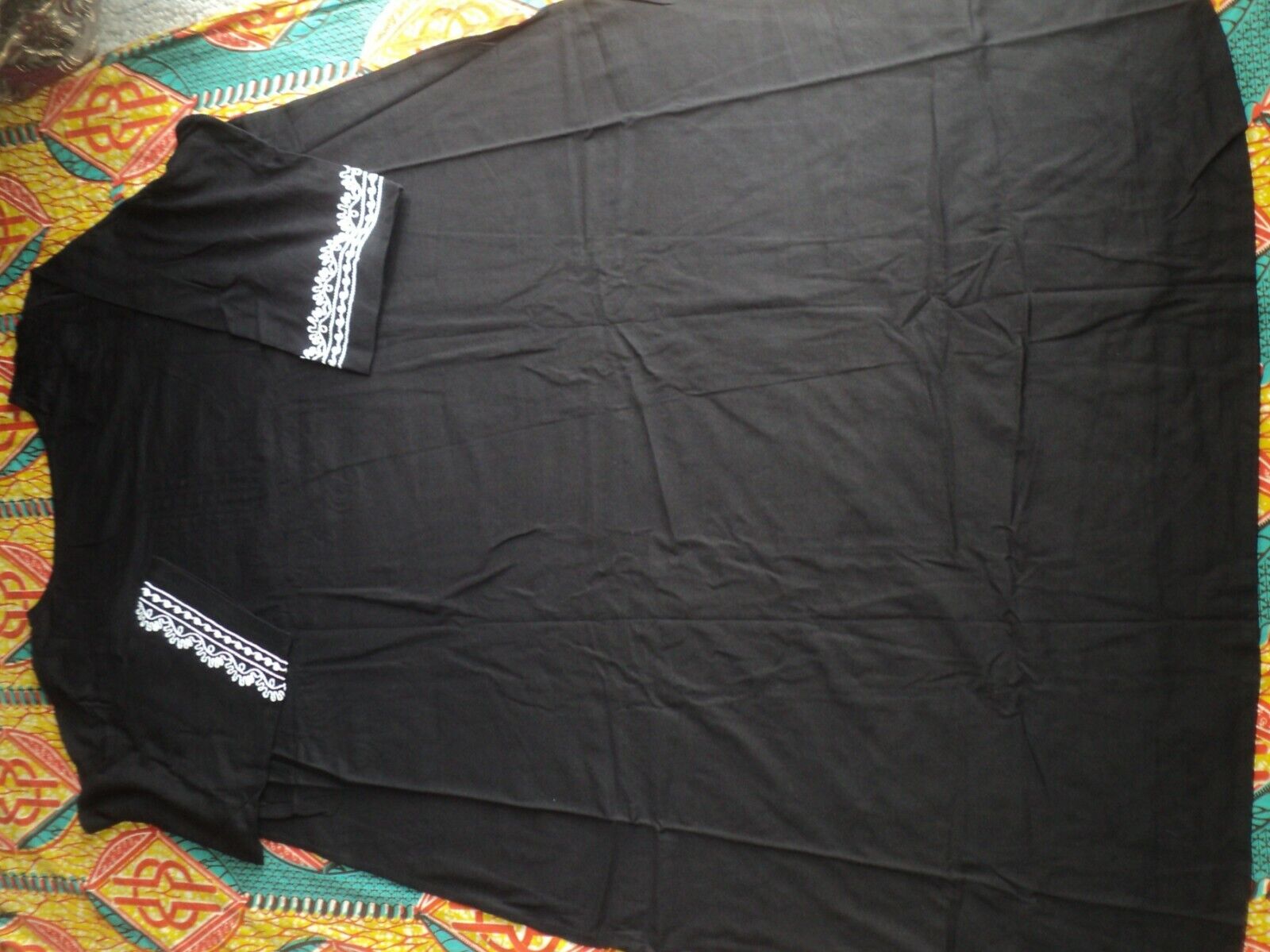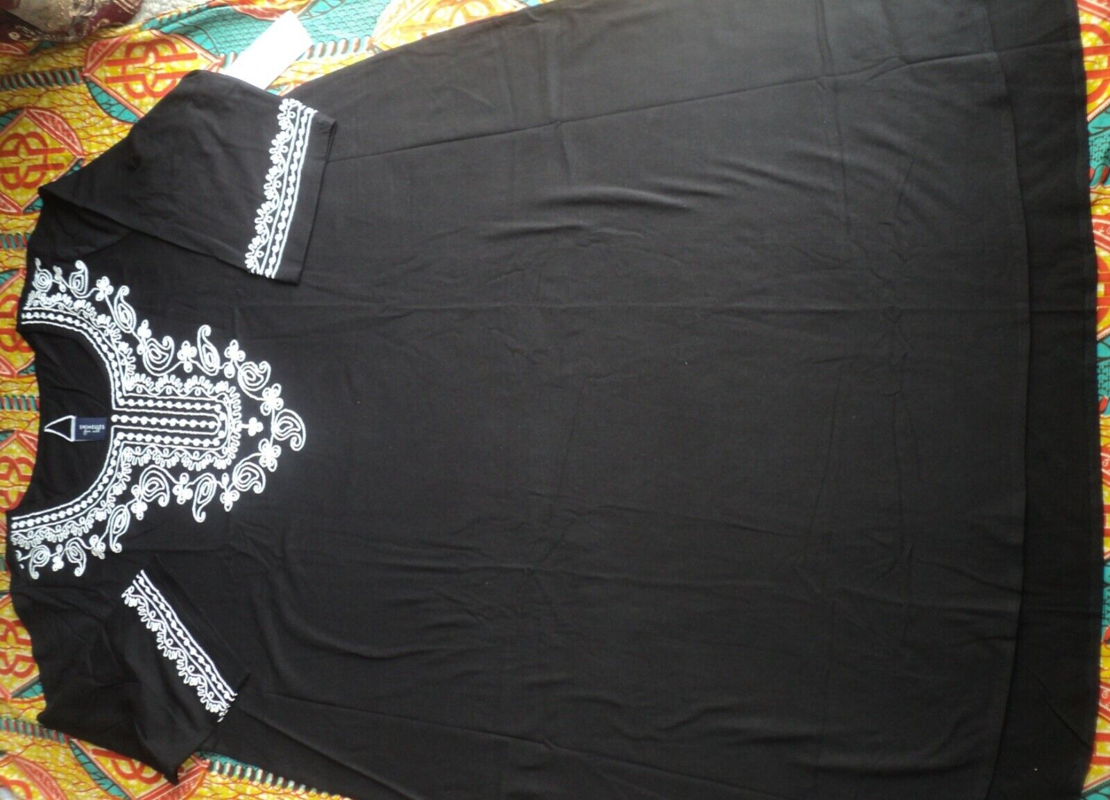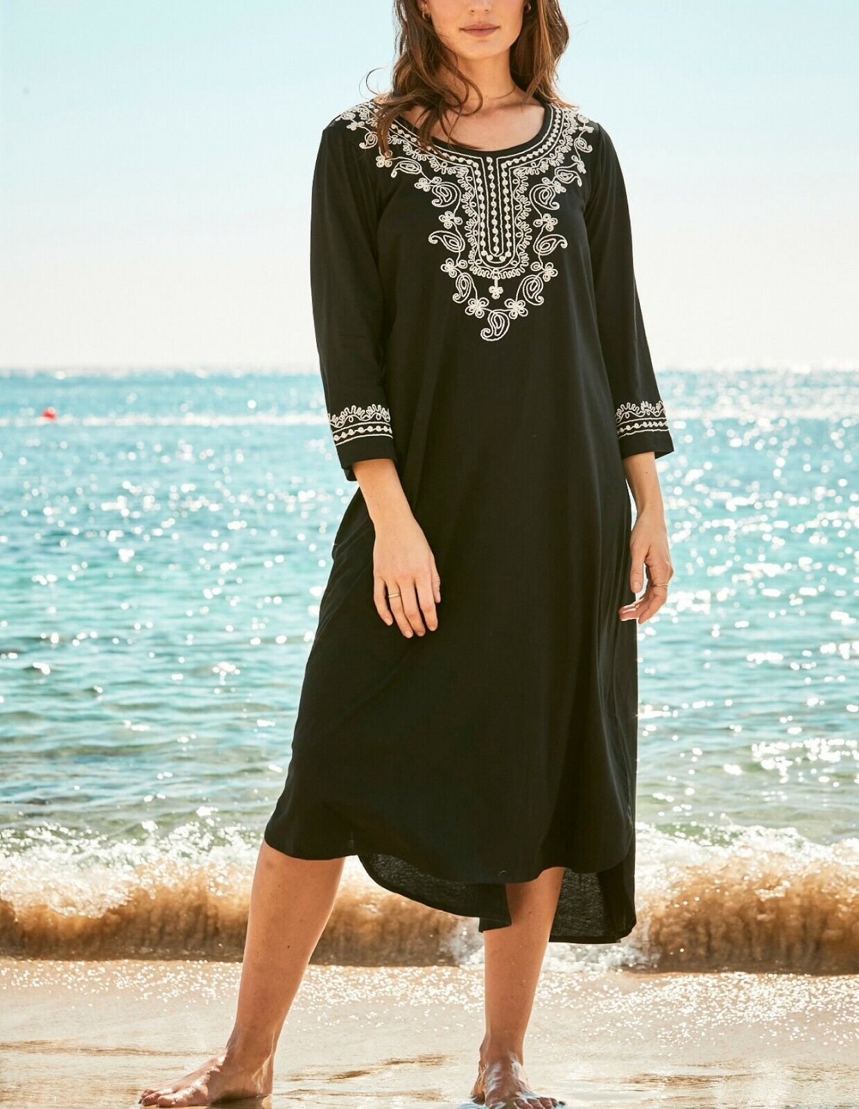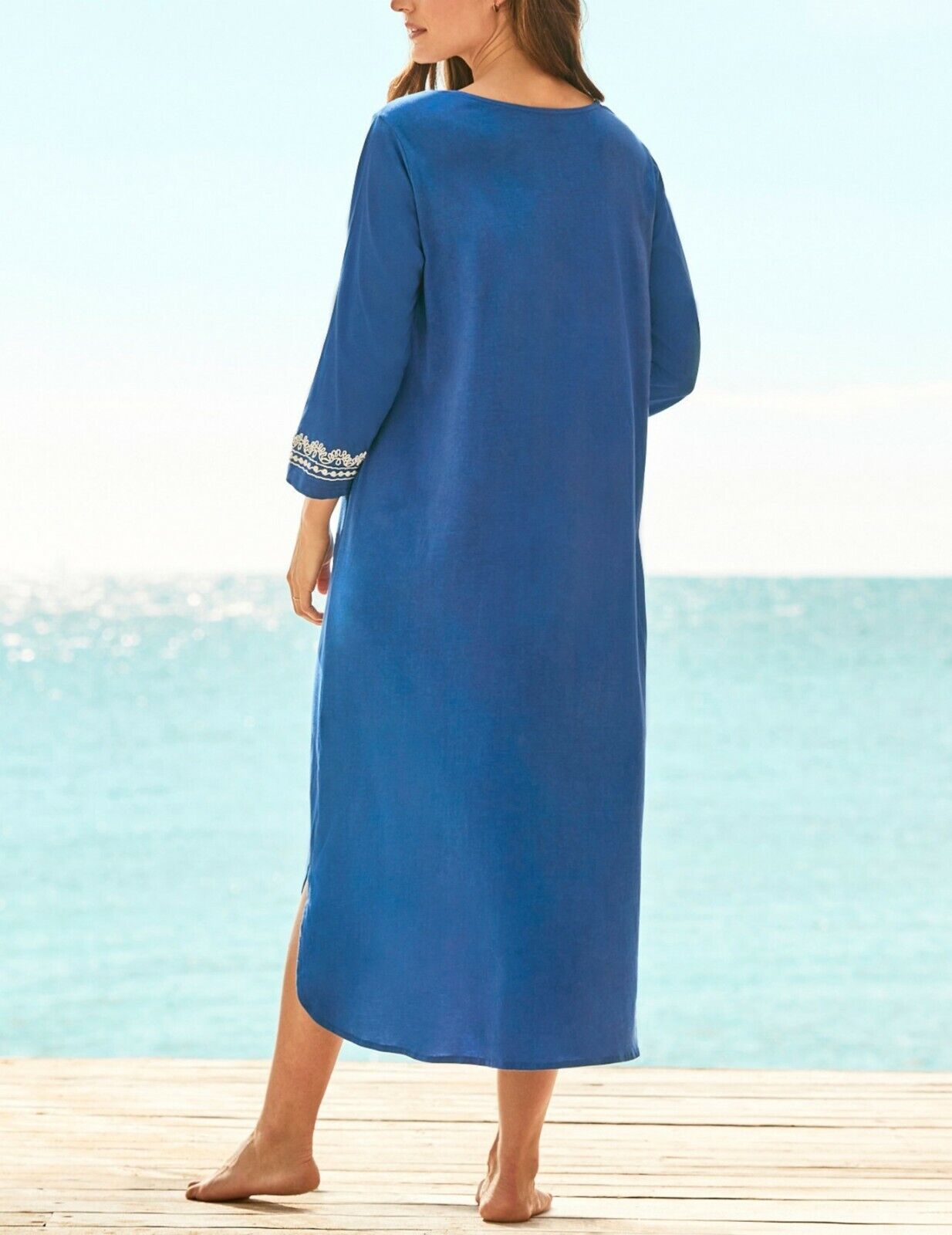 Embroidered scoop neckline and cuffs with a high-low hem and side slits. 3/4 sleeves. Bust: 56”. Hips: 65”. Front: Shoulder to base 441/2" length. Back: