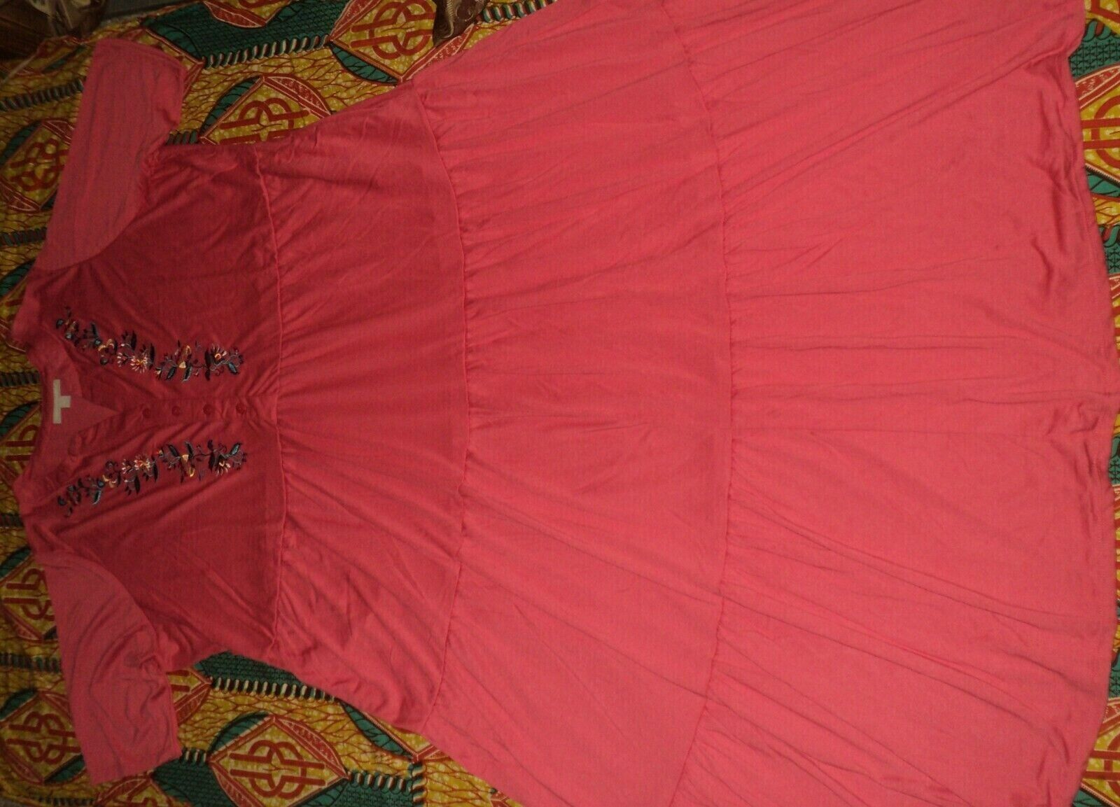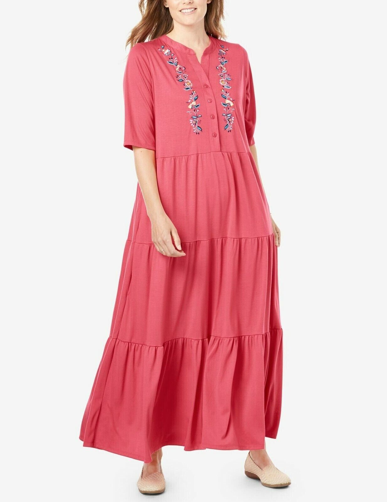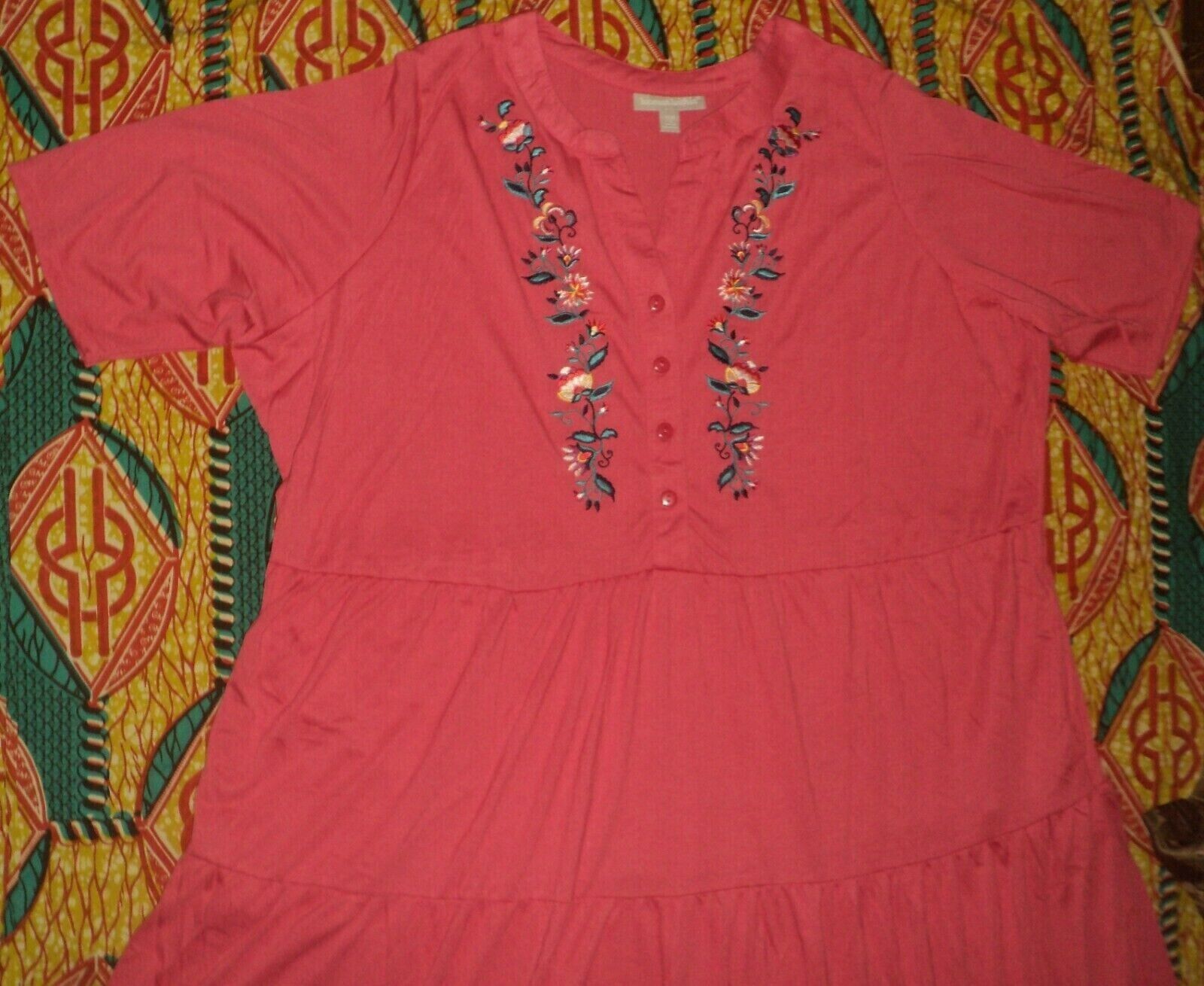 Woman Within Plus Size Rose Pink Embroidered Front Tiered Henley Dress Size 2X